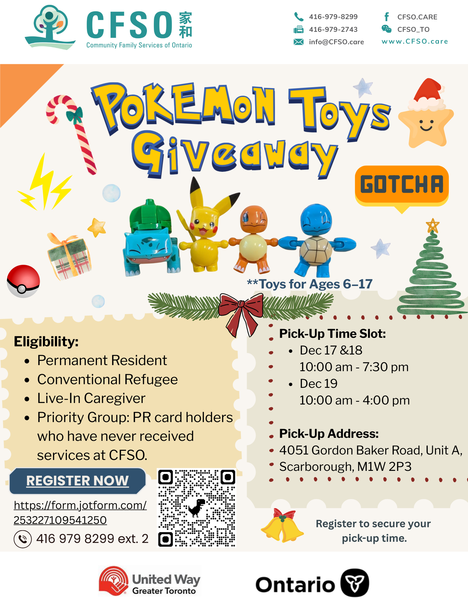 December 19 @ 10:00 AM - 4:00 PM Pokémon Figure Building Toys Giveaway CFSO Main Office 4051 Gordon Baker Rd, Unit A, Scarborough, Ontario, Canada Free