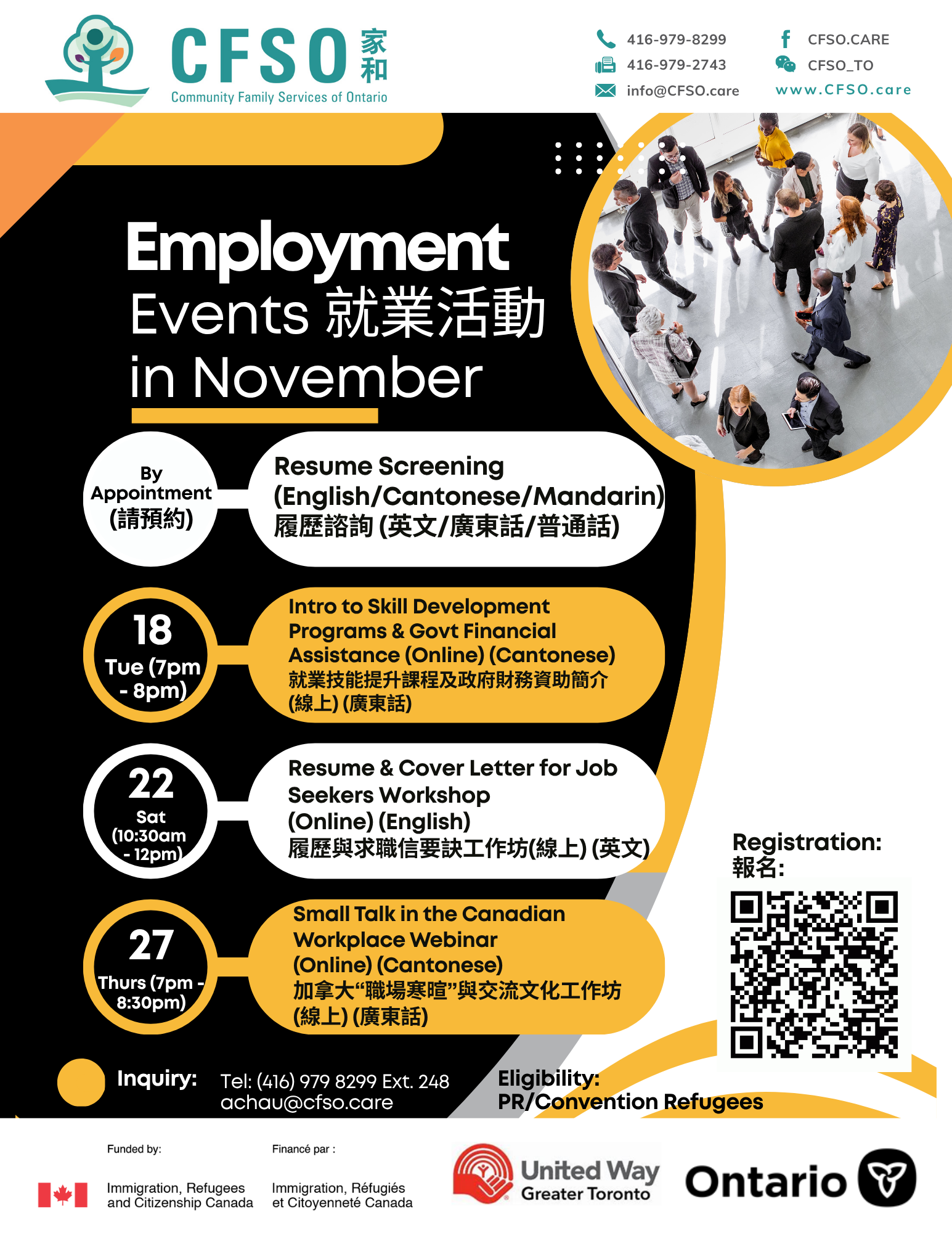 November 18 @ 8:00 AM - November 27 @ 5:00 PM Employment Events in November CFSO Main Office 4051 Gordon Baker Rd, Unit A, Scarborough, Ontario, Canada Free
